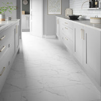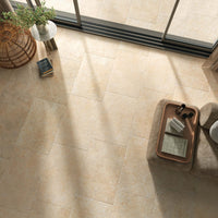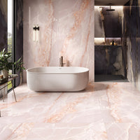Colour-match the paints and include interesting light fixtures, a unique sink, and coloured bath to achieve this look. For similar flooring a natural stone-look like our Winchester Beige tiles add warmth and intrigue. To focus on a lighter, more aged effect our Tapestry White tiles are the ideal candidate.