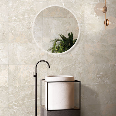 Looking for a bathroom tile with real presence? This elegant porcelain design could be it. It combines warm beige tones with striking stone detail - large mineral fragments and luminous white veins that catch the light beautifully.