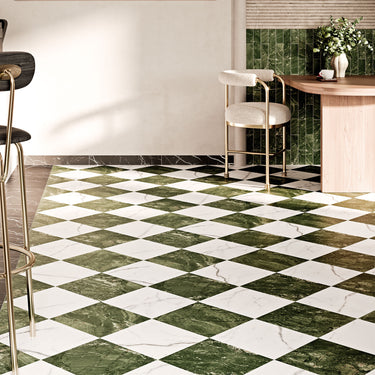 Checkerboard is back - and it’s never looked better. Savoy Green Mix reworks the classic floor with a deeper, more luxurious palette, pairing rich green marble tones with soft white for a look that feels both timeless and very now.